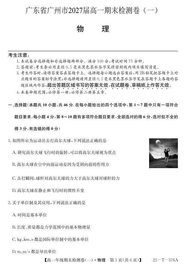 广东省广州市2024-2025学年高一上学期期末检测卷(一)物理.pdf