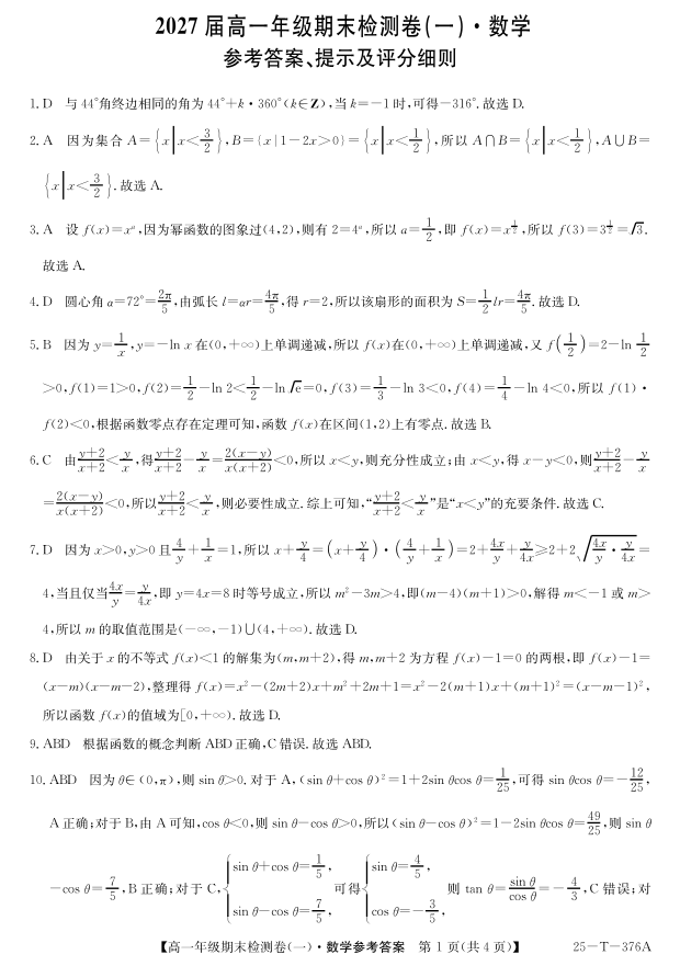 广东省广州市2024-2025学年高一上学期期末检测卷(一)数学答案.pdf