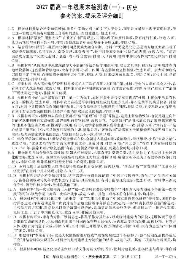 广东省广州市2024-2025学年高一上学期期末检测卷(一)历史答案.pdf