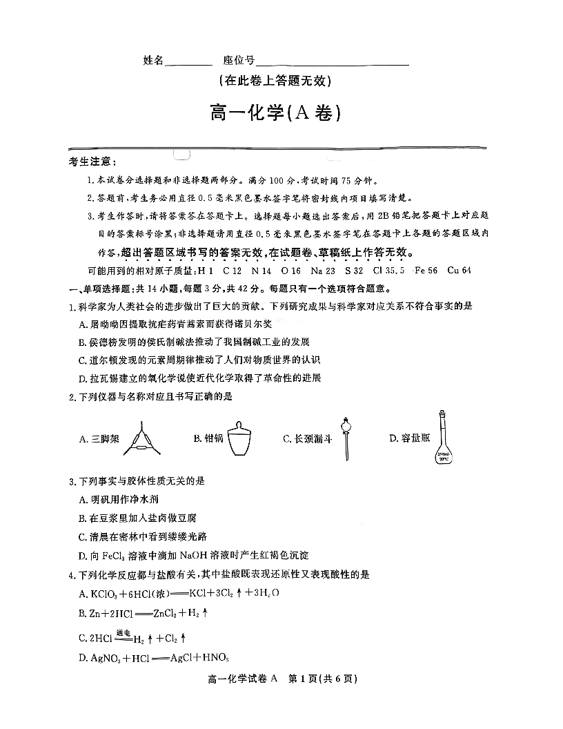 安徽省皖江名校2024-2025学年高一上学期12月联考 化学.pdf