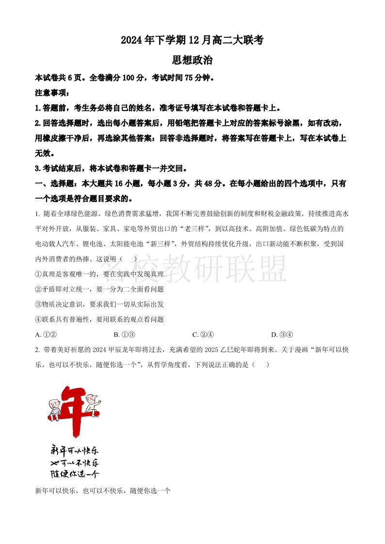 湖南省名校联盟2024-2025学年高二上学期12月检测 政治.pdf