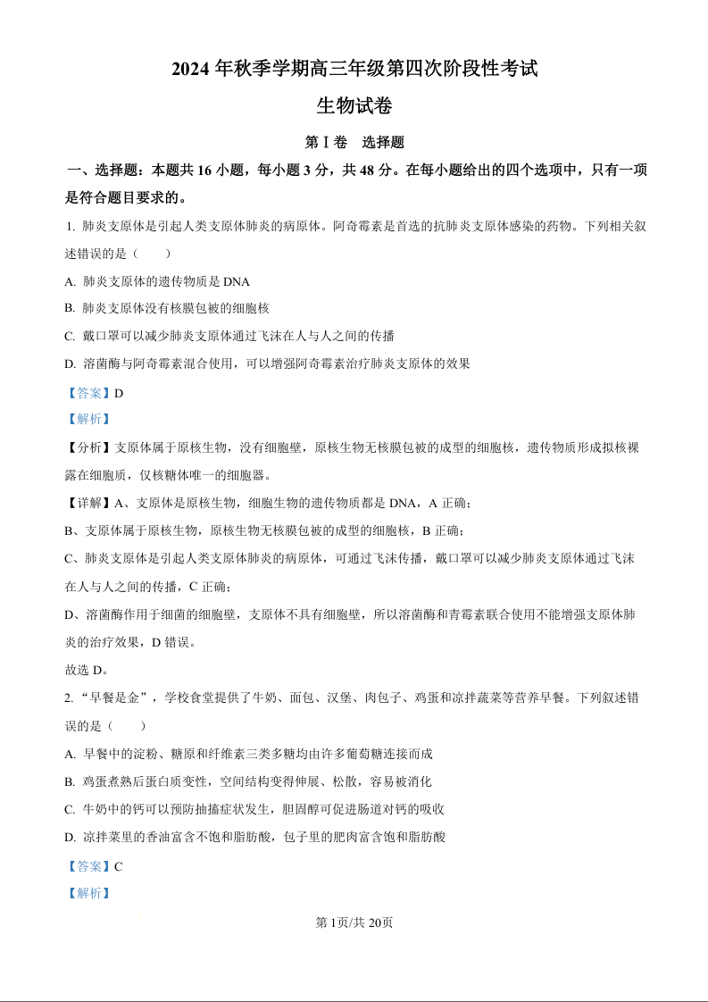 甘肃省平凉一中2024年秋学期高三年级第四次阶段性考试 生物答案.docx