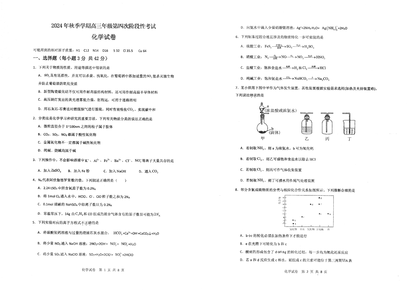 甘肃省平凉一中2024年秋学期高三年级第四次阶段性考试 化学.pdf