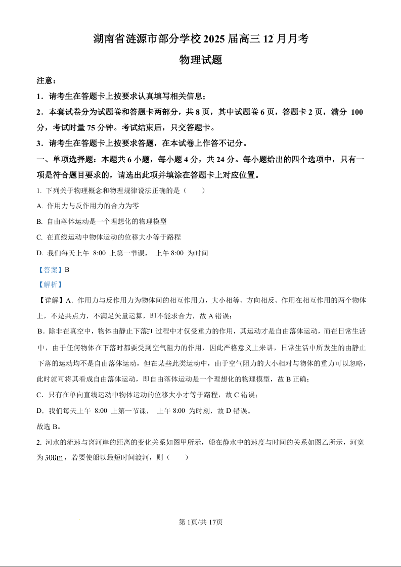湖南省娄底市涟源市部分学校2025届高三上学期12月月考 物理答案.docx