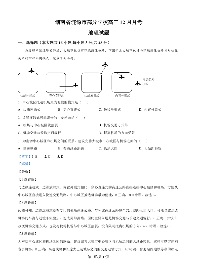 湖南省娄底市涟源市部分学校2025届高三上学期12月月考 地理答案.docx