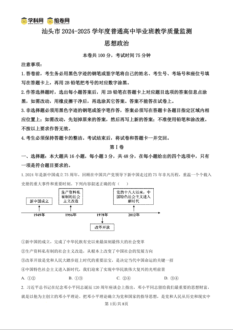 广东省汕头市2025届高三上学期12月期末教学质量监测 政治.docx
