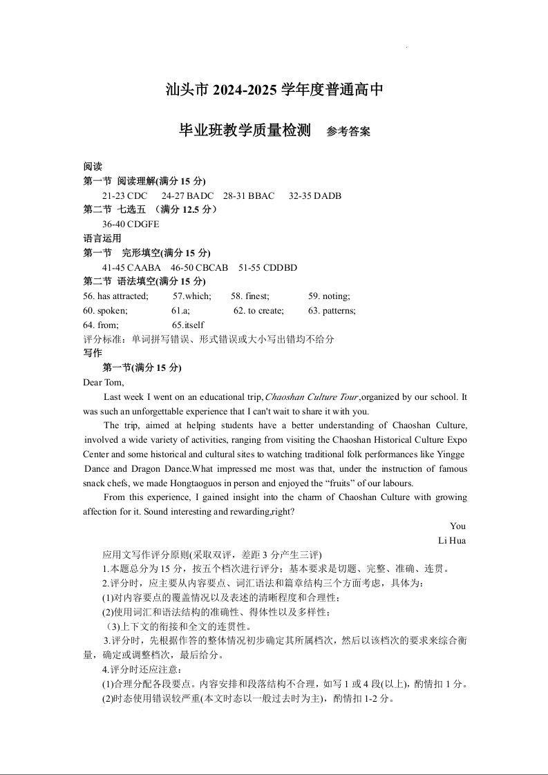 广东省汕头市2025届高三上学期12月期末教学质量监测 英语答案.docx