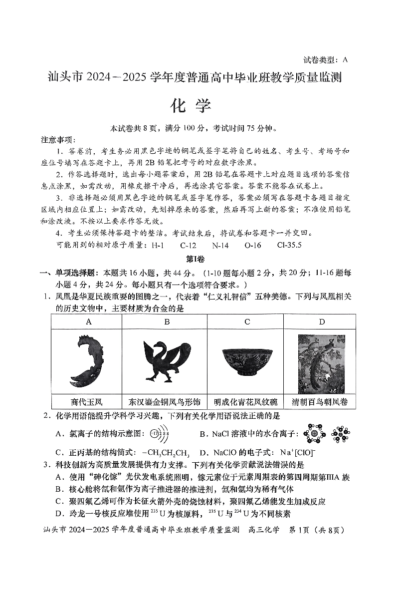 广东省汕头市2025届高三上学期12月期末教学质量监测 化学.pdf
