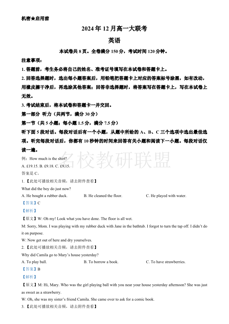 湖南省五市十校教研教改共同体2024-2025学年高一上学期12月月考 英语答案.pdf
