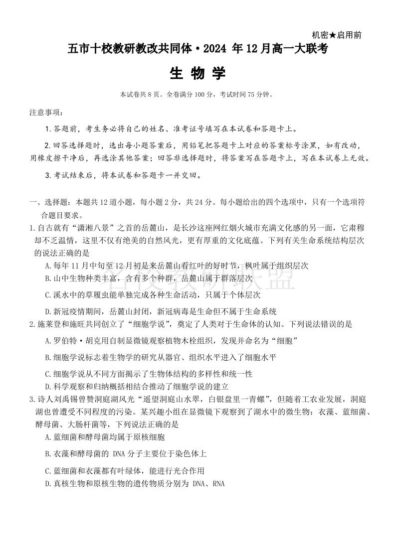 湖南省五市十校教研教改共同体2024-2025学年高一上学期12月月考 生物.pdf