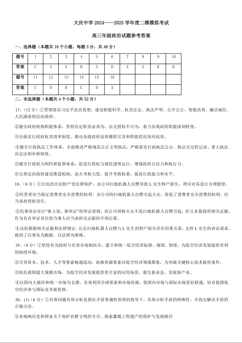 黑龙江省大庆中学2025届高三上学期第二次模拟考试 政治答案.docx