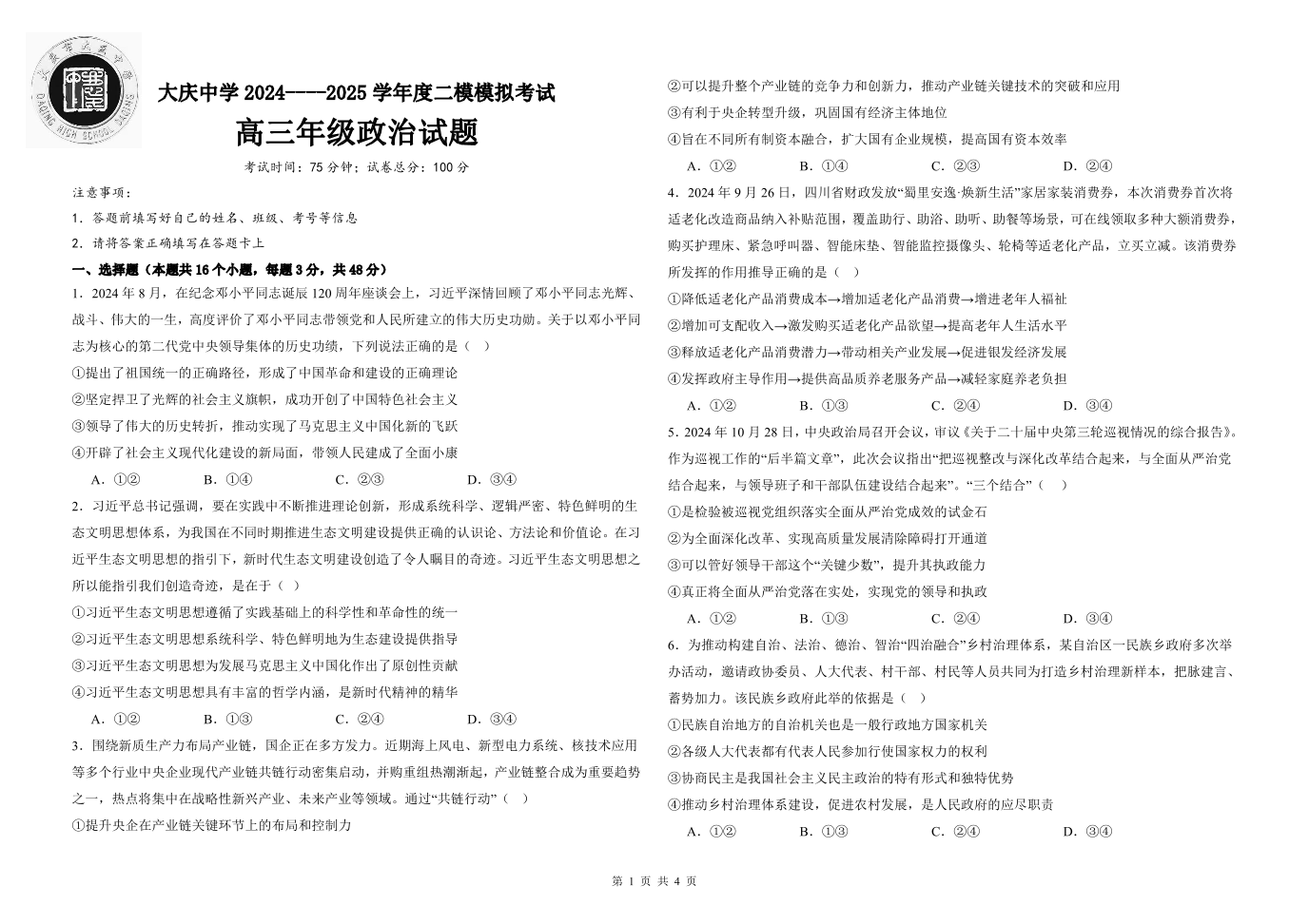 黑龙江省大庆中学2025届高三上学期第二次模拟考试 政治.pdf