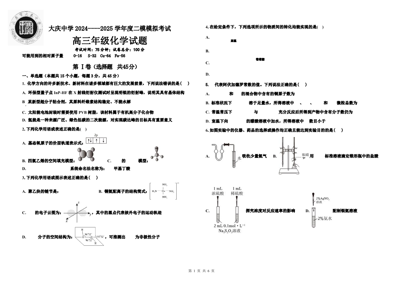 黑龙江省大庆中学2025届高三上学期第二次模拟考试 化学.pdf
