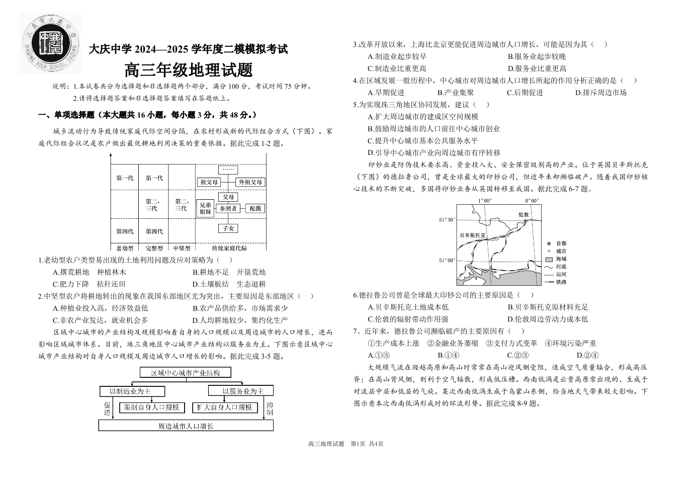 黑龙江省大庆中学2025届高三上学期第二次模拟考试 地理.pdf