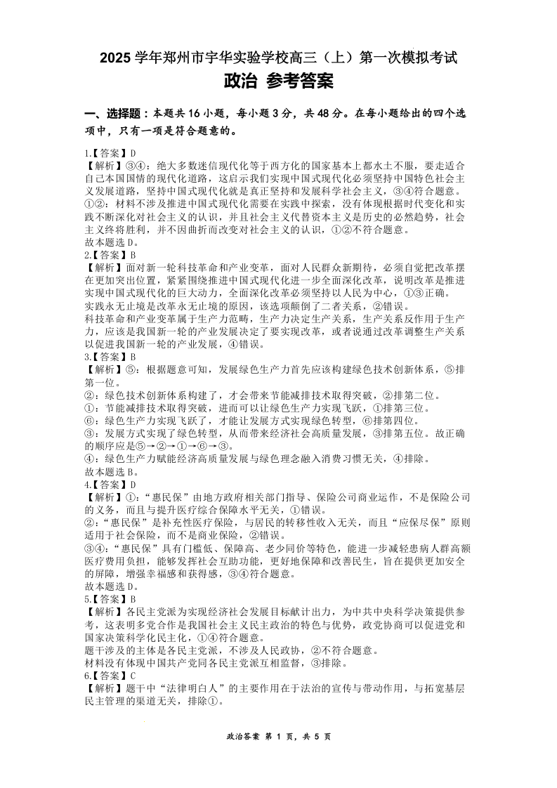 河南省郑州市宇华实验学校2025届高三上学期第一次模拟考试 政治答案.docx