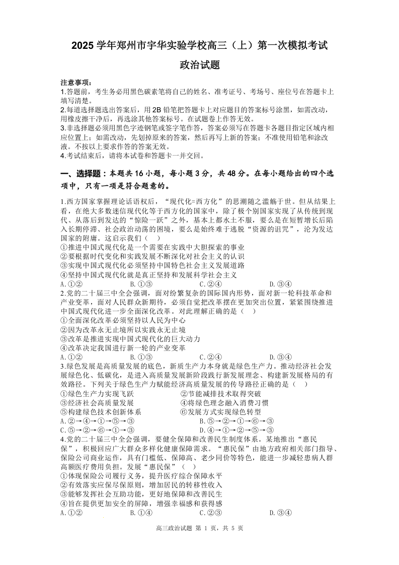 河南省郑州市宇华实验学校2025届高三上学期第一次模拟考试 政治.docx
