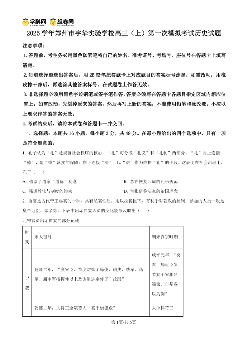 河南省郑州市宇华实验学校2025届高三上学期第一次模拟考试 历史.docx
