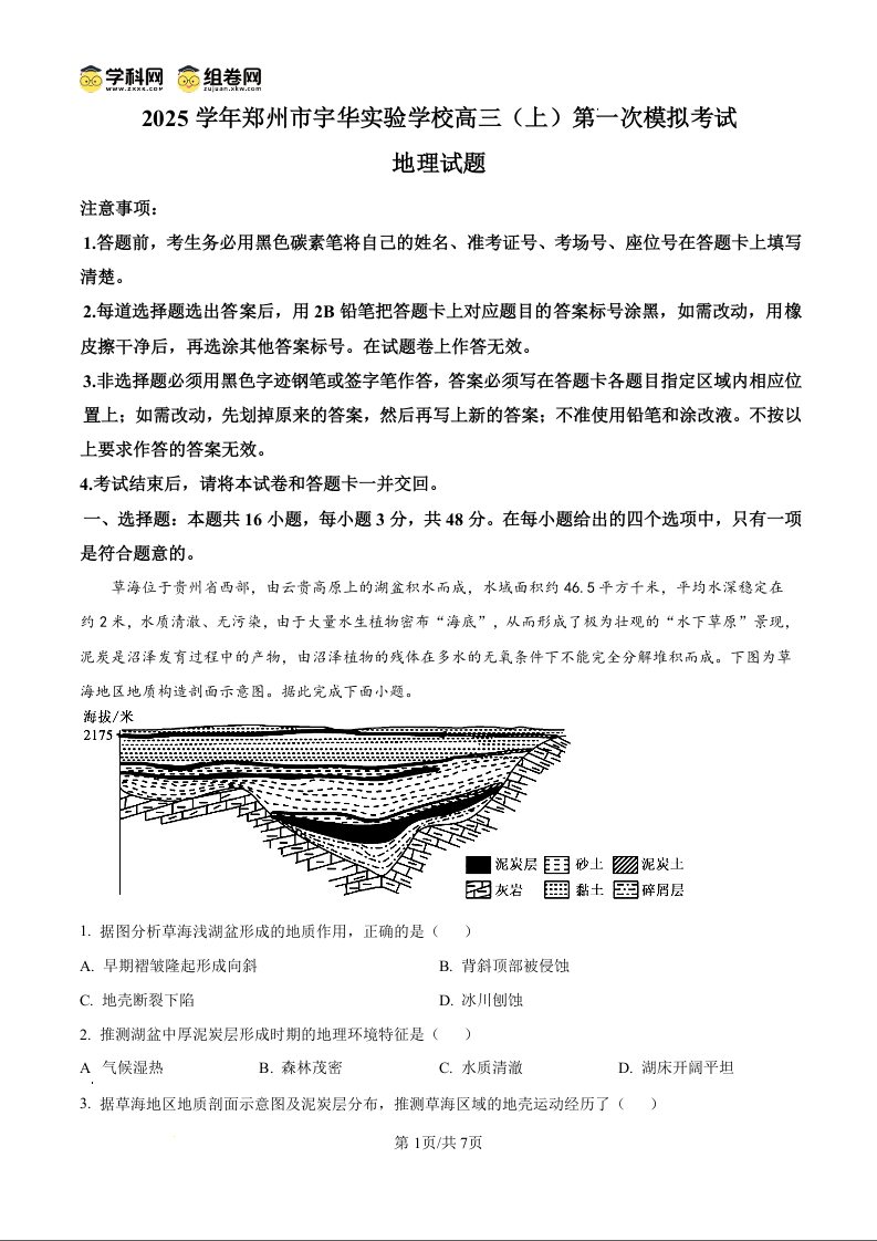 河南省郑州市宇华实验学校2025届高三上学期第一次模拟考试 地理.docx