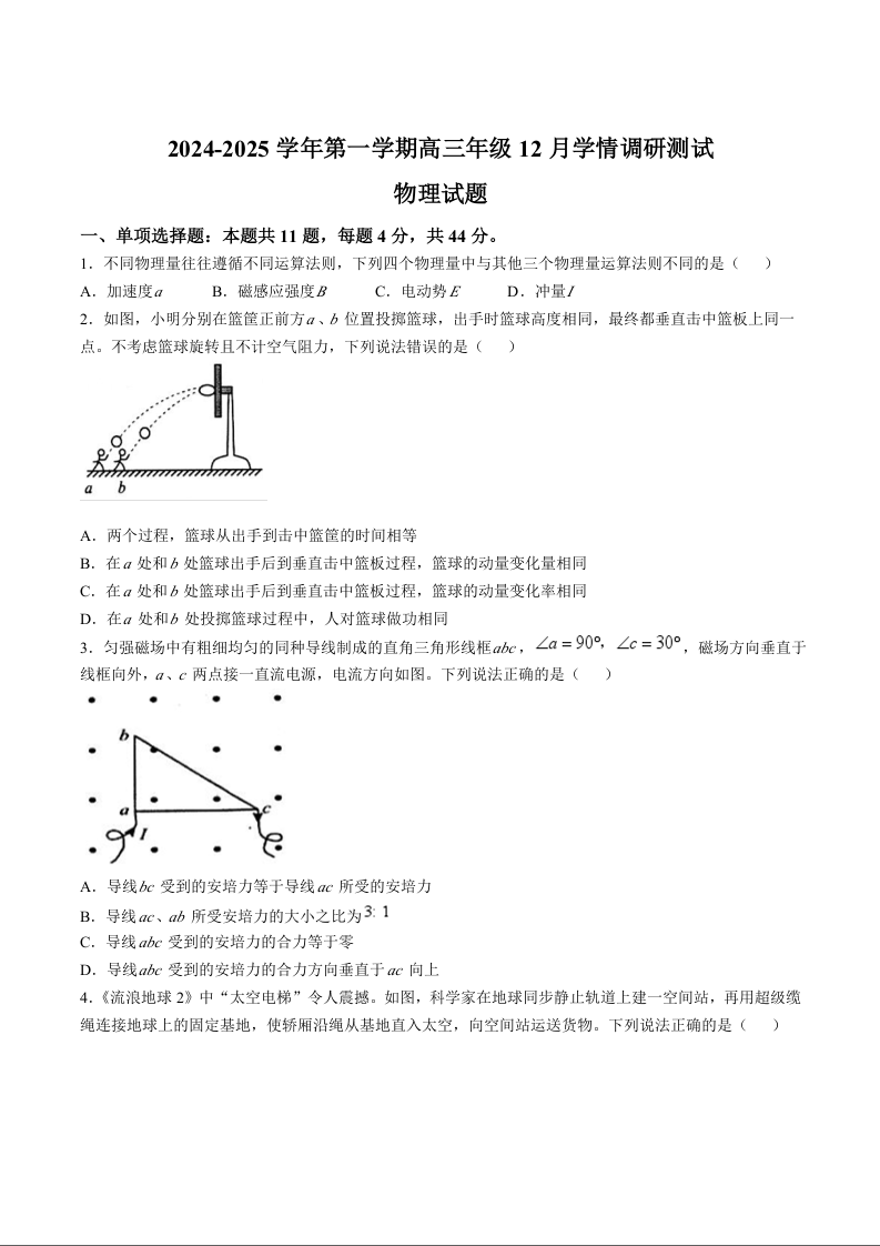江苏省扬州市高邮市2025届高三上学期12月学情调研测试 物理.docx