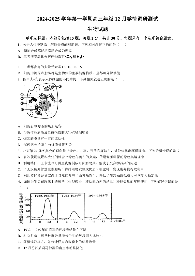 江苏省扬州市高邮市2025届高三上学期12月学情调研测试 生物.docx
