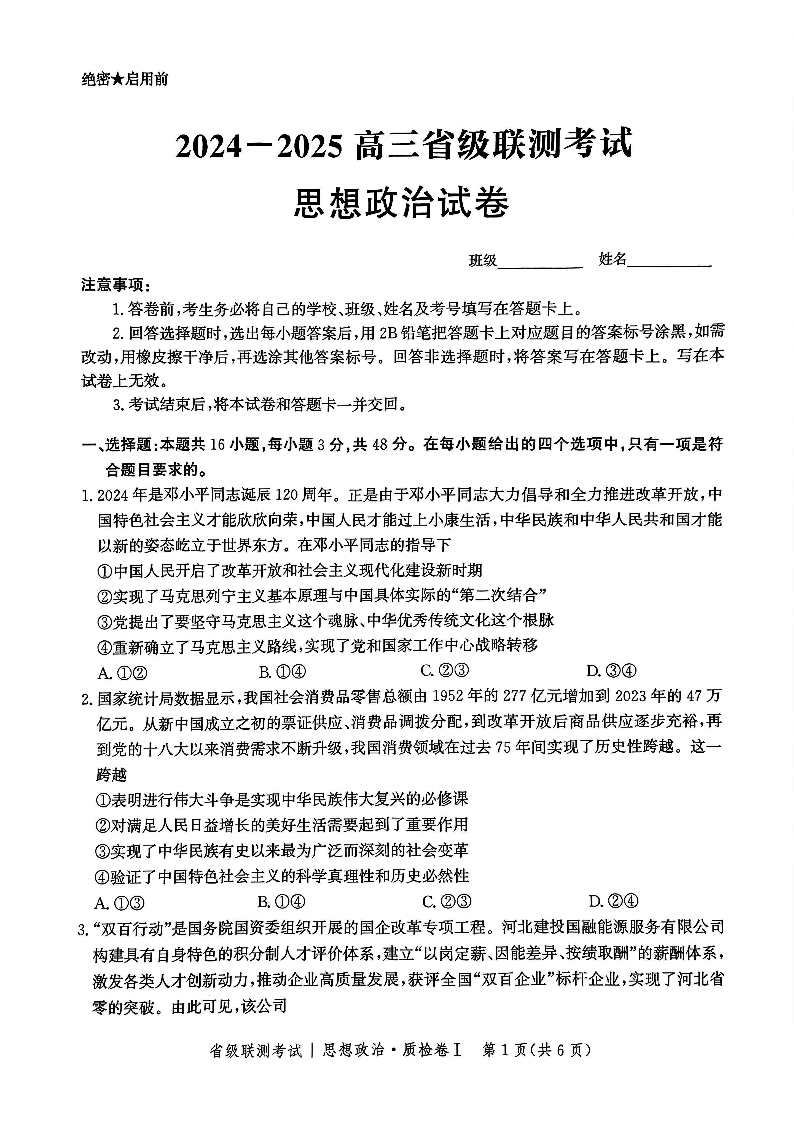 河北省2024-2025学年高三省级联测考试 政治.pdf