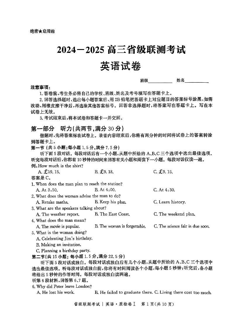 河北省2024-2025学年高三省级联测考试 英语.pdf