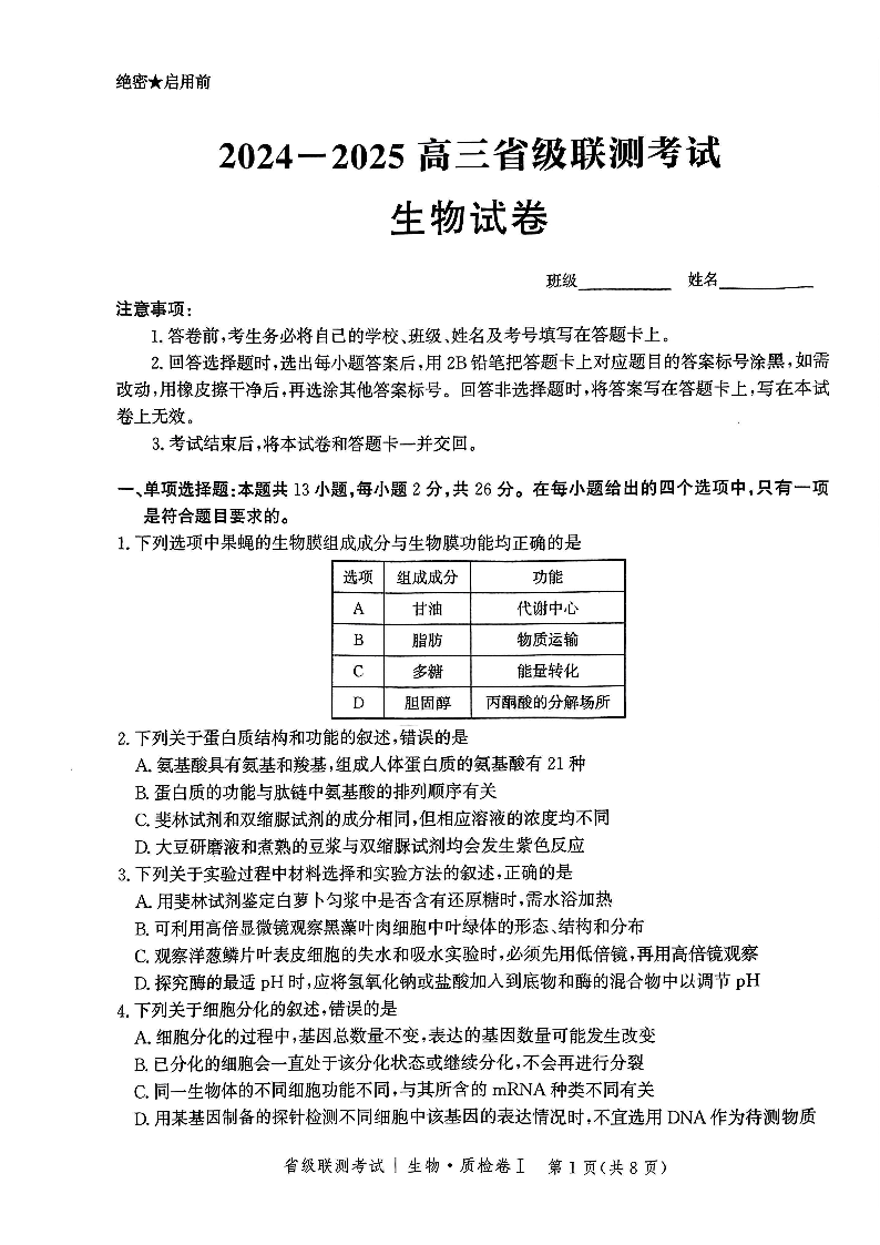 河北省2024-2025学年高三省级联测考试 生物.pdf
