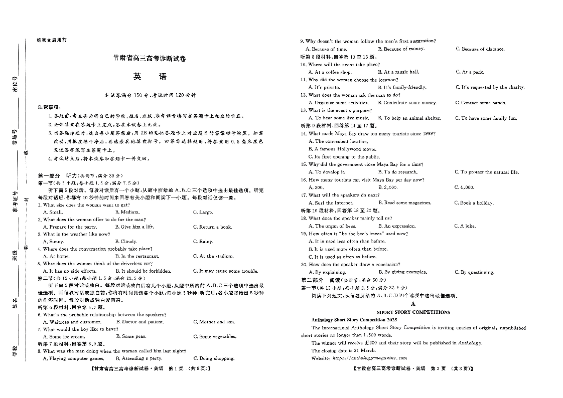 甘肃省2025届高三上学期12月高考诊断 英语.pdf