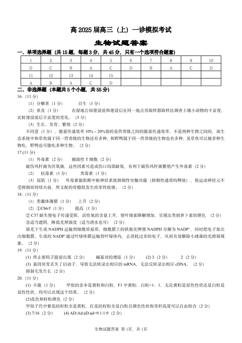 重庆市育才中学校2025届高三一诊模拟考试 生物答案.pdf