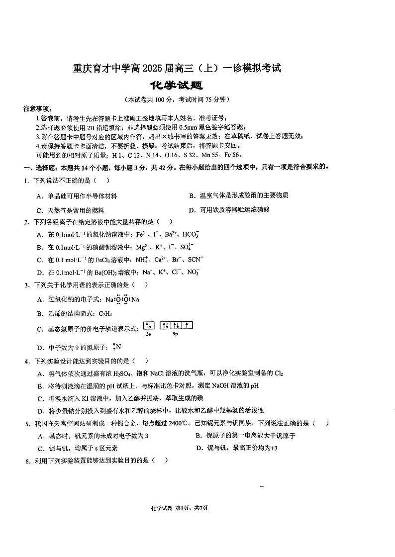 重庆市育才中学校2025届高三一诊模拟考试 化学.pdf