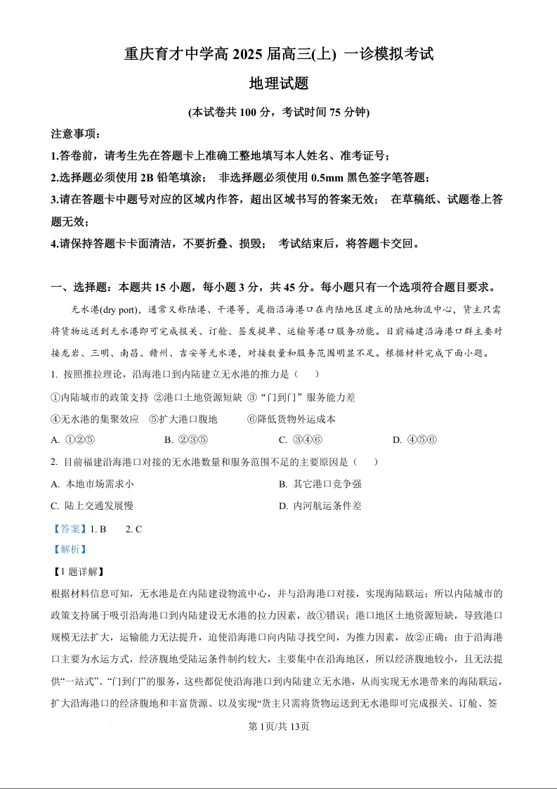 重庆市育才中学校2025届高三一诊模拟考试 地理答案.docx