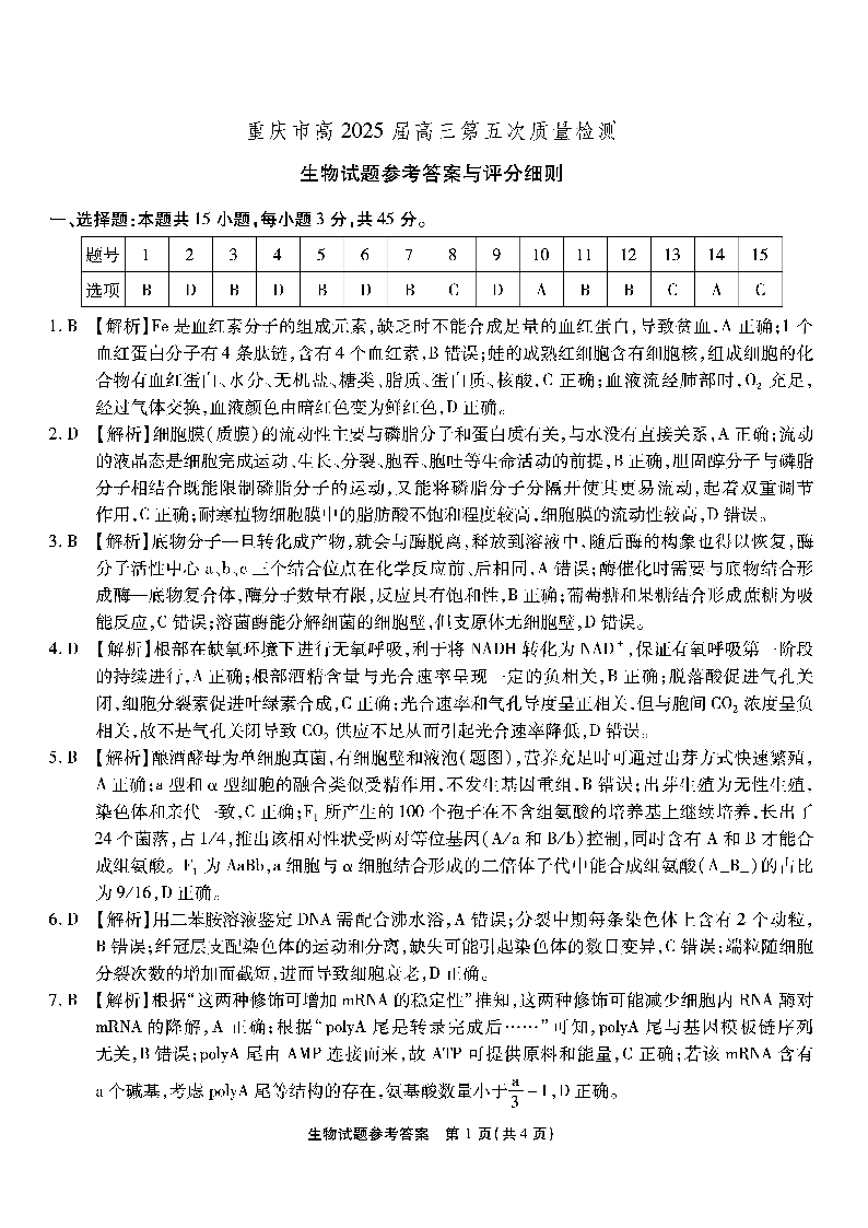 重庆市南开中学2025届高三第五次质量检测 生物答案.pdf