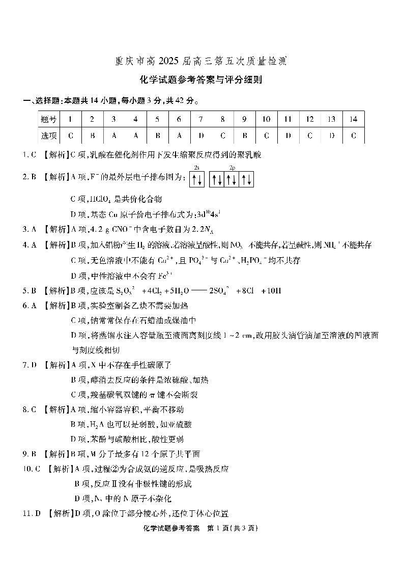 重庆市南开中学2025届高三第五次质量检测 化学答案.pdf