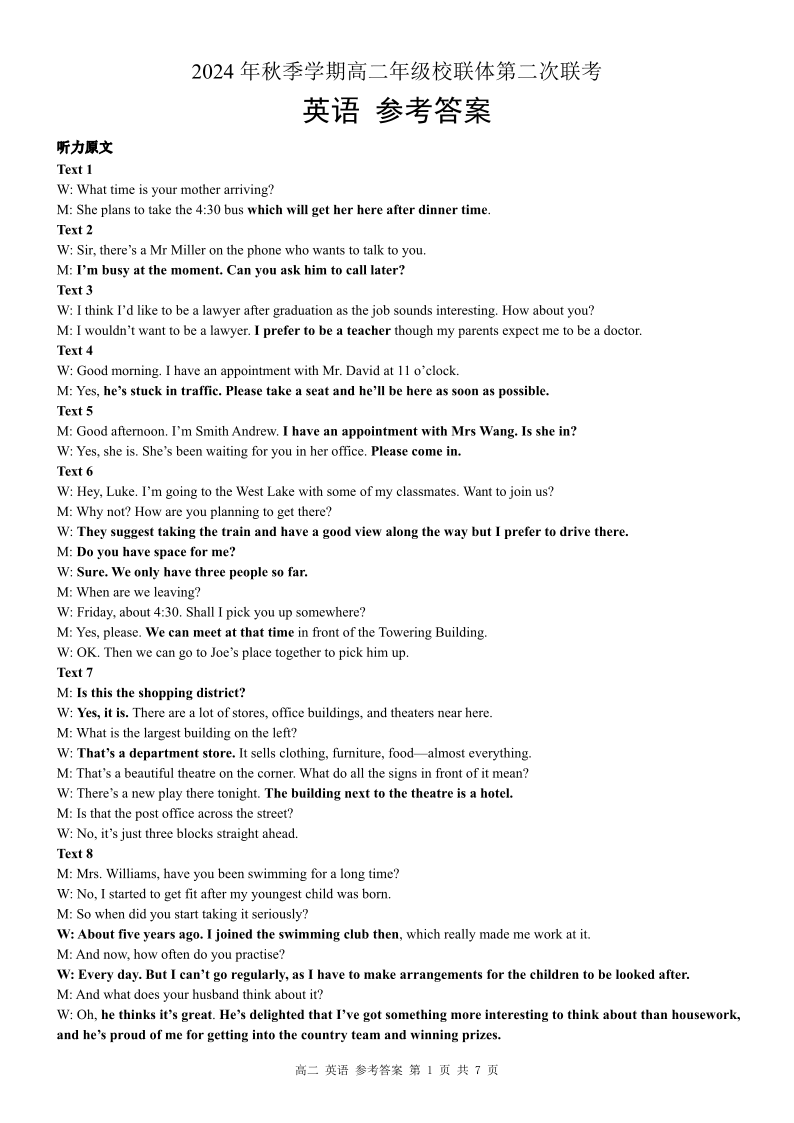广西壮族自治区河池市十校联体2024年秋季高二12月第二次联考 英语答案.pdf