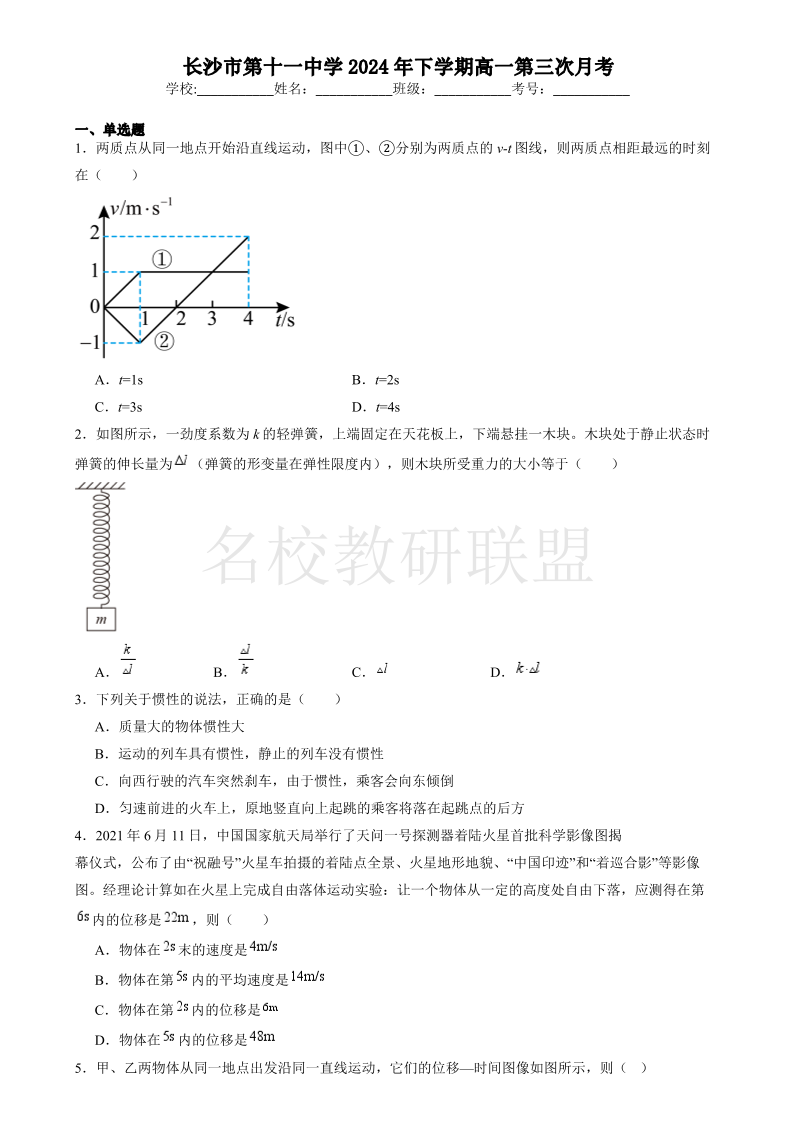 湖南省长沙市第十一中学2024-2025学年高一上学期12月月考 物理.pdf