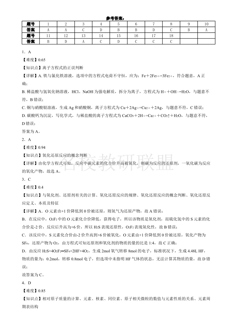 湖南省长沙市第十一中学2024-2025学年高一上学期12月月考 化学答案.pdf