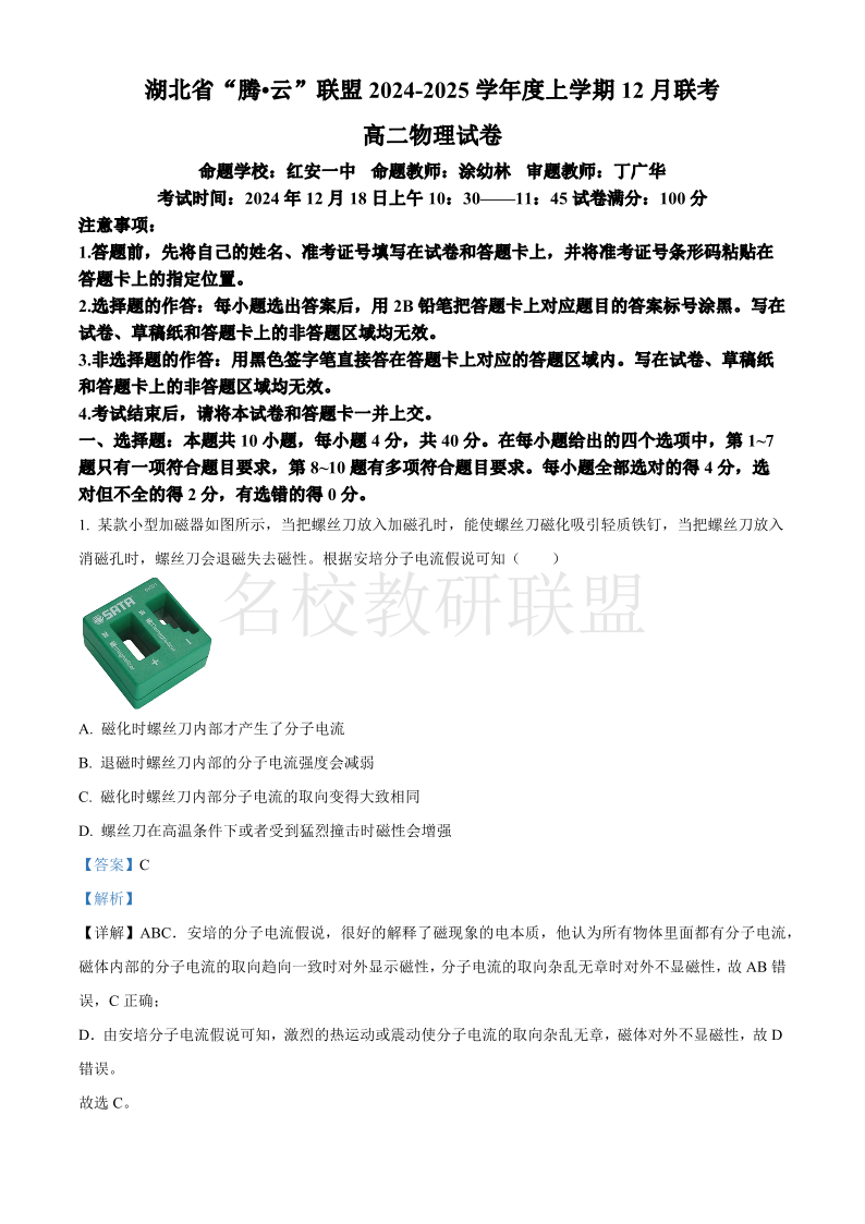 湖北省腾云联盟2024-2025学年高二上学期12月联考 物理答案.pdf