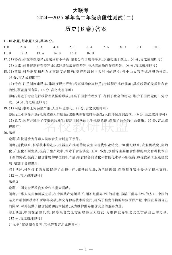 天一大联考2024-2025学年高二年级阶段性测试(二)历史答案.pdf