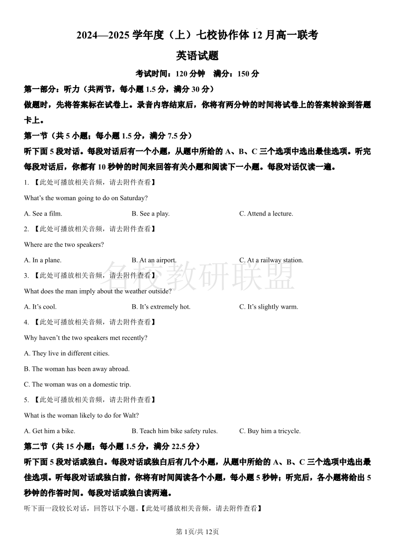 辽宁省七校协作体2024-2025学年高一上学期12月联考 英语.pdf