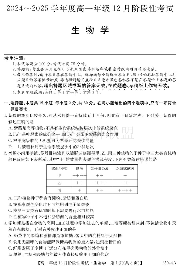 黑龙江省2024-2025学年高一上学期12月月考 生物.pdf