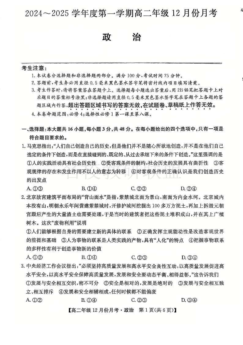 河北省沧州市十校2024-2025学年高二上学期12月月考 政治.pdf