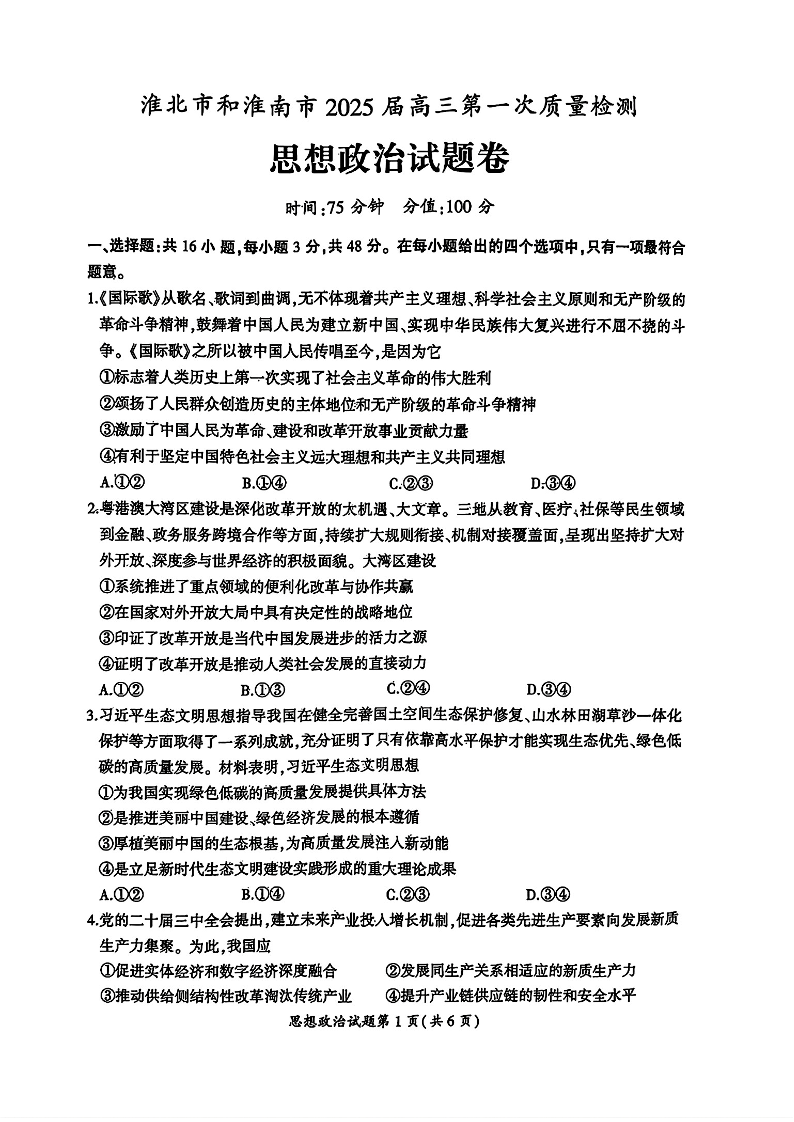 安徽省淮北市和淮南市2025届高三第一质量检测 政治.pdf