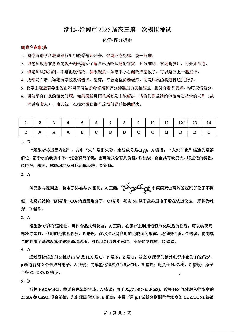 安徽省淮北市和淮南市2025届高三第一质量检测 化学答案.pdf
