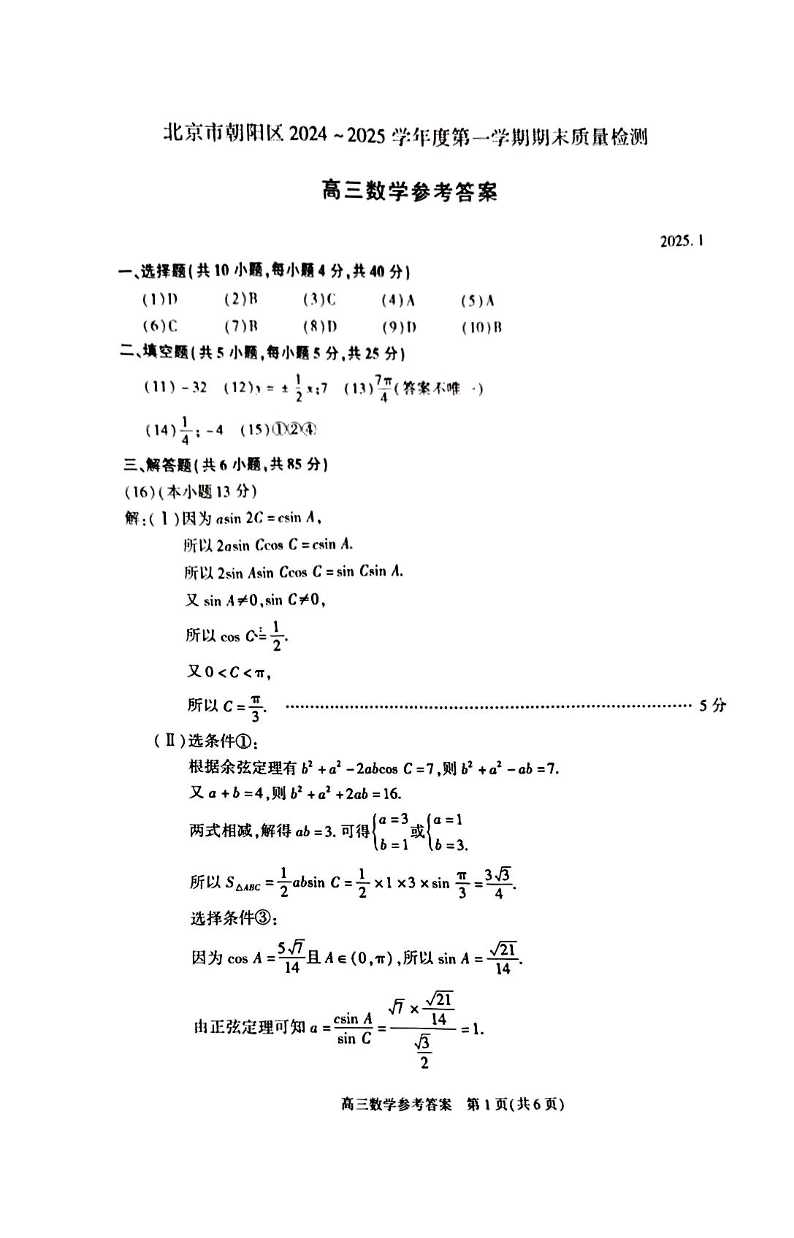 北京市朝阳区2024-2025学年高三第一学期期末质量检测 数学答案.pdf