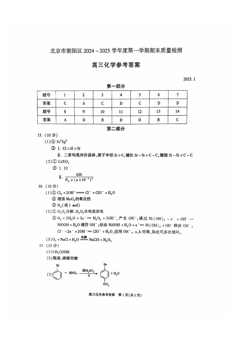 北京市朝阳区2024-2025学年高三第一学期期末质量检测 化学答案.pdf