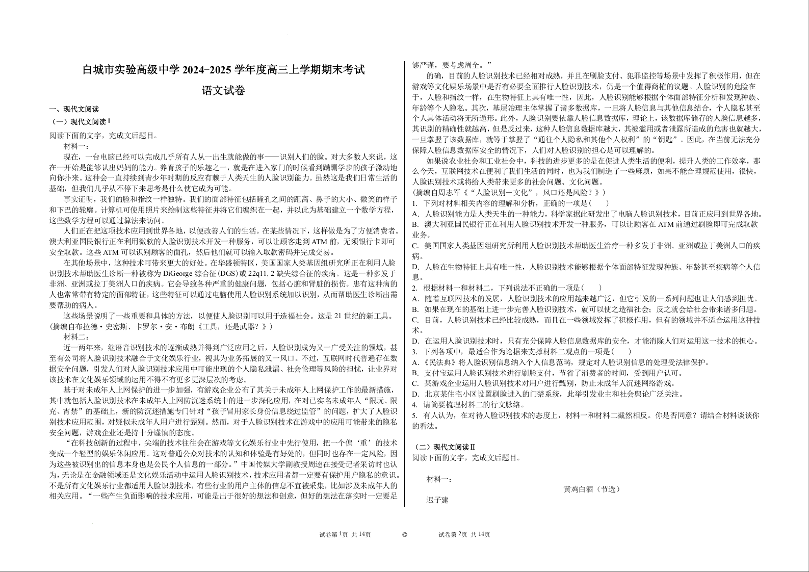 吉林省白城市实验高级中学2025届高三上学期1月期末考试 语文.docx