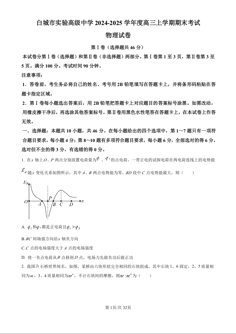 吉林省白城市实验高级中学2025届高三上学期1月期末考试 物理.docx
