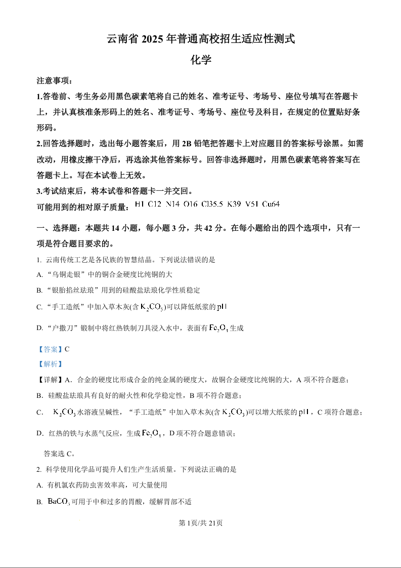 云南省2025年高考综合改革适应性演练 化学答案.docx