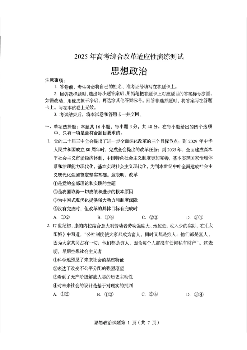 四川省2025年高考综合改革适应性演练 政治.pdf
