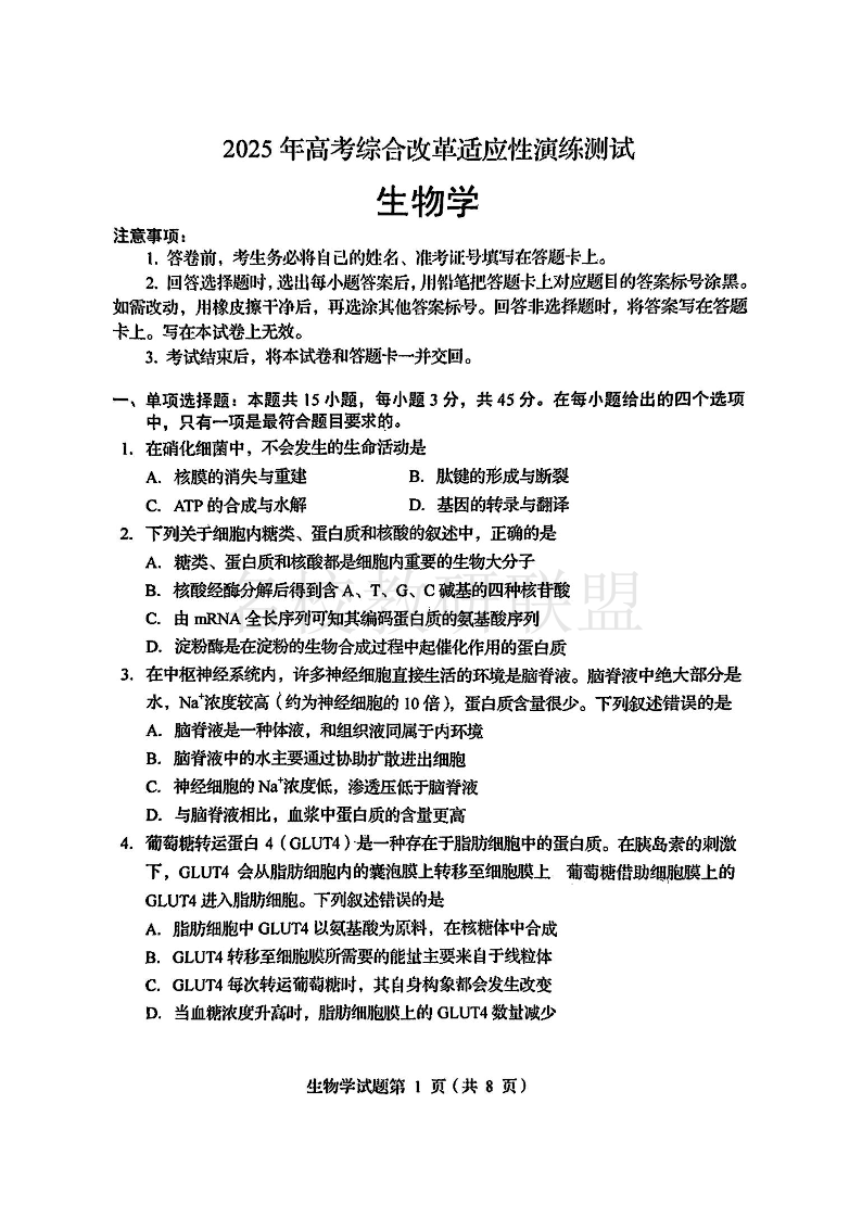 四川省2025年高考综合改革适应性演练 生物.pdf